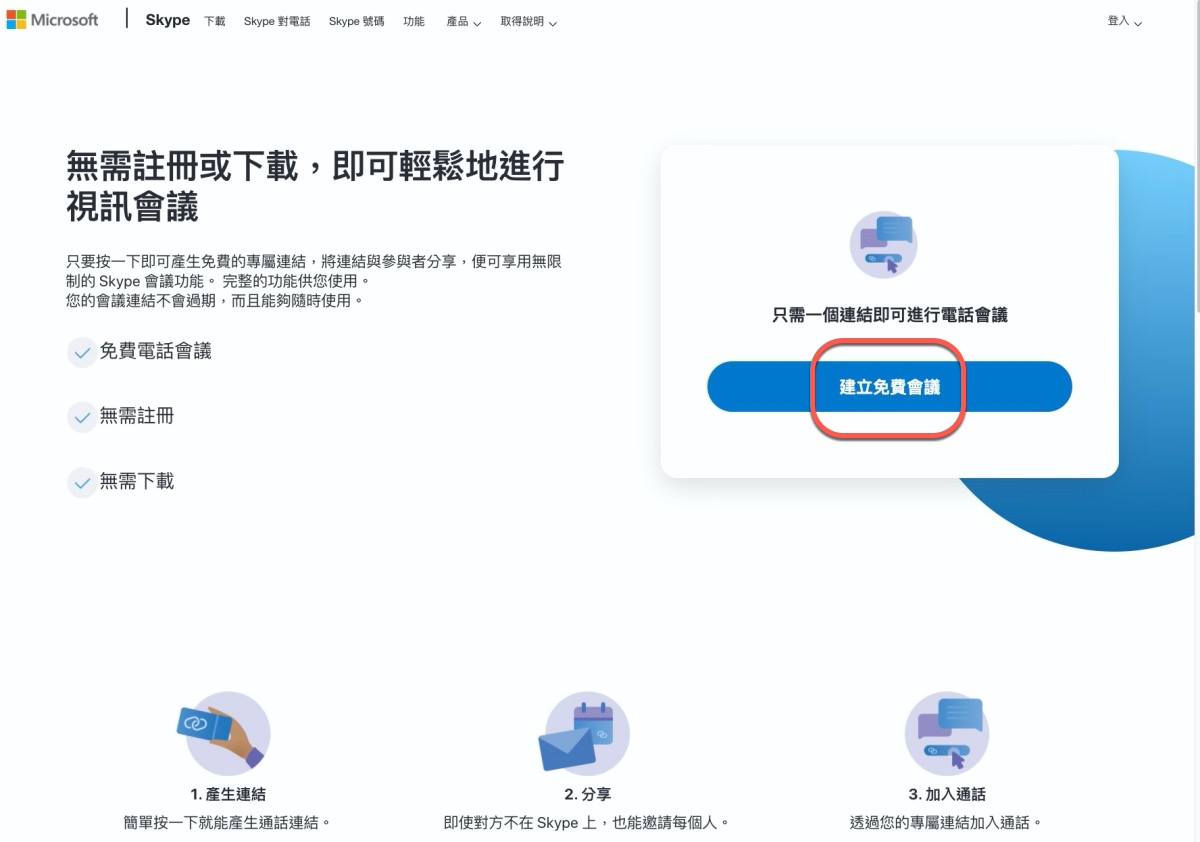 Meet Now 服務:https://www.skype.com/zh-Hant/free-conference-call/