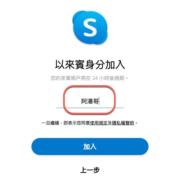 加入的時候,如果你的電腦有安裝 Skype 會出現這畫面,問你要不要透過 Skype 來開啟,當然你也可以取消,直接「以來賓身份加入」。
