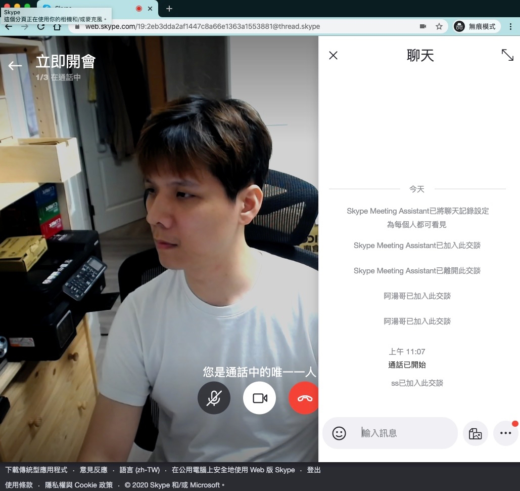 功能基本上和 Skype 很類似,就是簡易的版本,一樣可以視訊及文字聊天,我想對於現在很多突然改成在家工作的公司來說,這應該是很棒的一個選項,因為不用安裝軟體也不用註冊,方便很多。