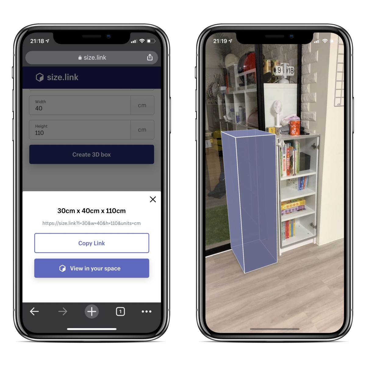 阿湯如果要購買一個櫃子之前,都會好好的測量,以便買回家後可以放置在想放的位置,也會大約想像一下會佔用多大的空間,不過想像終歸是想像,有想搬回家組裝起來還是會覺得比想像中的大或小,大家應該也跟我有一樣的感覺吧,不過現在 AR 發展的很厲害,有個網站叫做 Size.link,讓你透過瀏覽器就可以直接使用 AR 實境來製作虛擬箱子,擺在你想放置的位置上,這麼一來就知道到底這大小會佔用你家空間的實際畫面,感受一下再決定要不要買,非常實用。