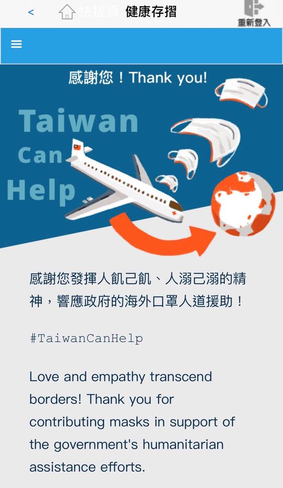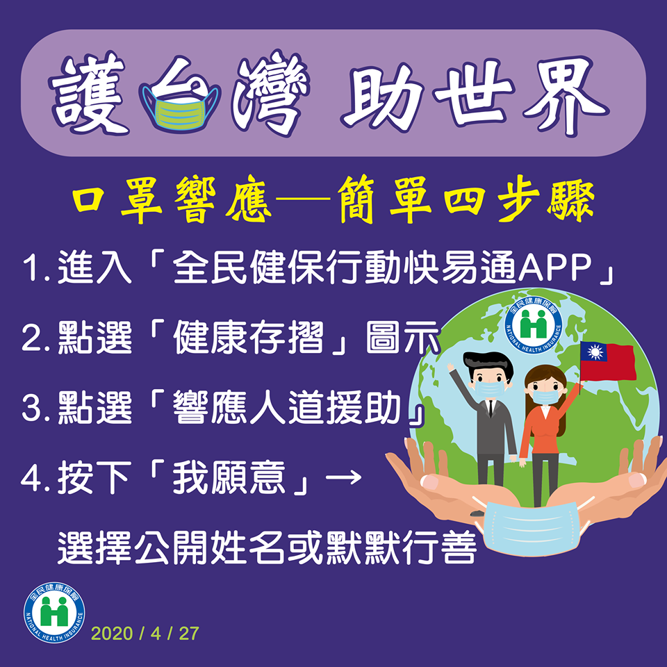 「護台灣 助世界!」 「Who can help? WE all can help.」,不知道眼尖的朋友這幾天打開健保快易通 APP 時,有沒有發現多了一個「響應人道援助」的選項呢?或是今天在 Facebook 上看到有些朋友分享了「感謝您,Thank You」的圖示?原來這是我們發起的 「TaiwanCanHelp」活動,在不影響國內防疫準備的情形下,將自己口罩實名制 2.0 (2020 年 3 月 12 日)啟動以來沒有領取的口罩,優先提供給需要幫助國家的醫護人員!