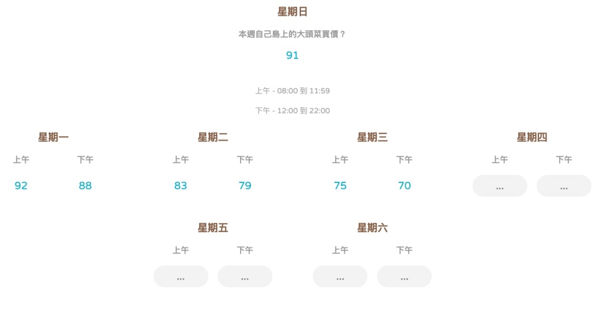 接下來就只要輸入星期日你購買大頭菜的價格,以及每一天上午跟下午的價格,就能進行預測,所以每天你至少要上線二次去問一下價格多少,畢竟大家的島大頭菜價格都會是不同的,只能自己問。