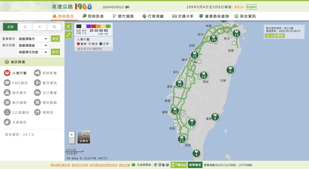 除了 app 之外,高速公路 1968 網頁版也在即時路況中加入「人潮示警」的選項,為全台疫情防護多一層保護。