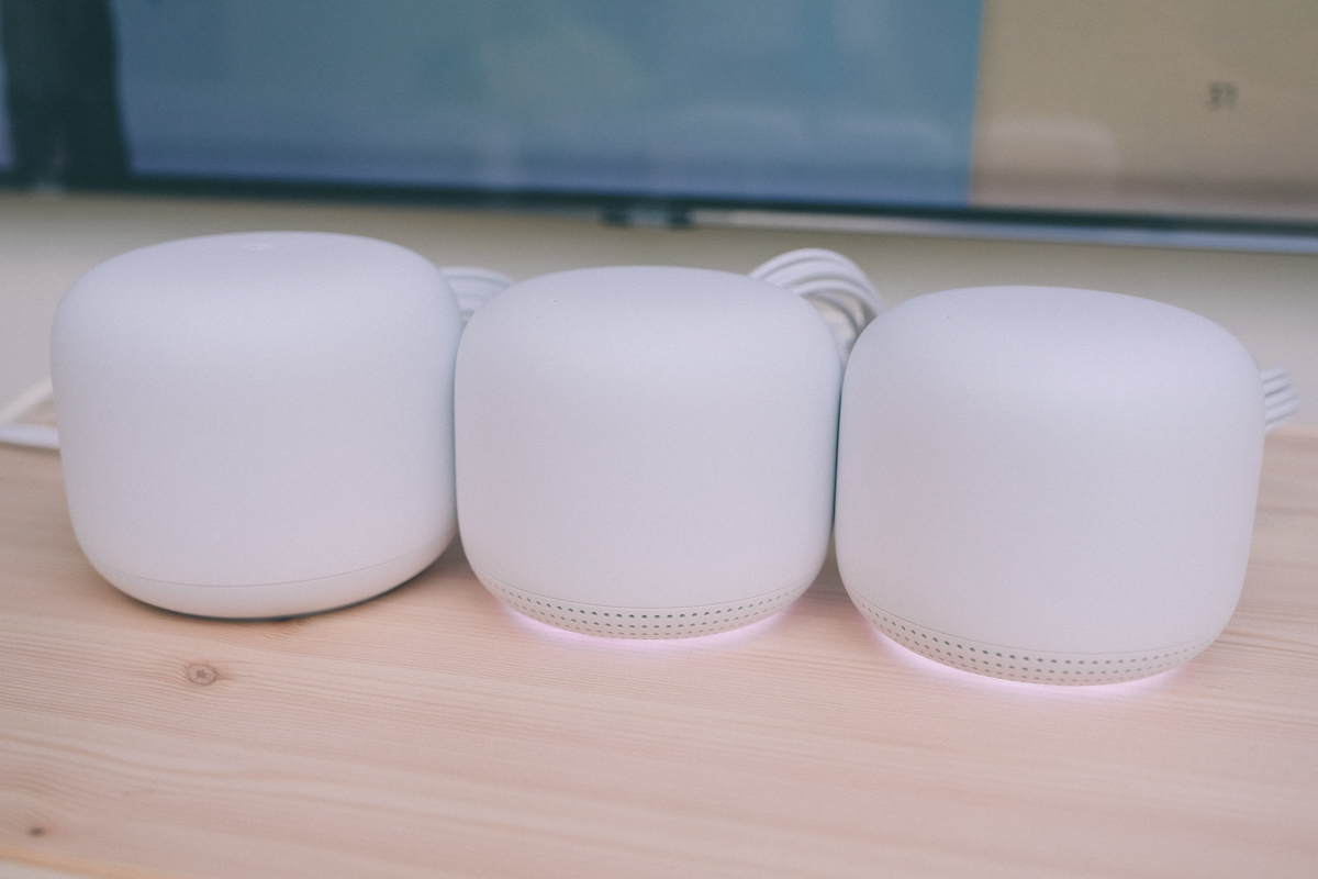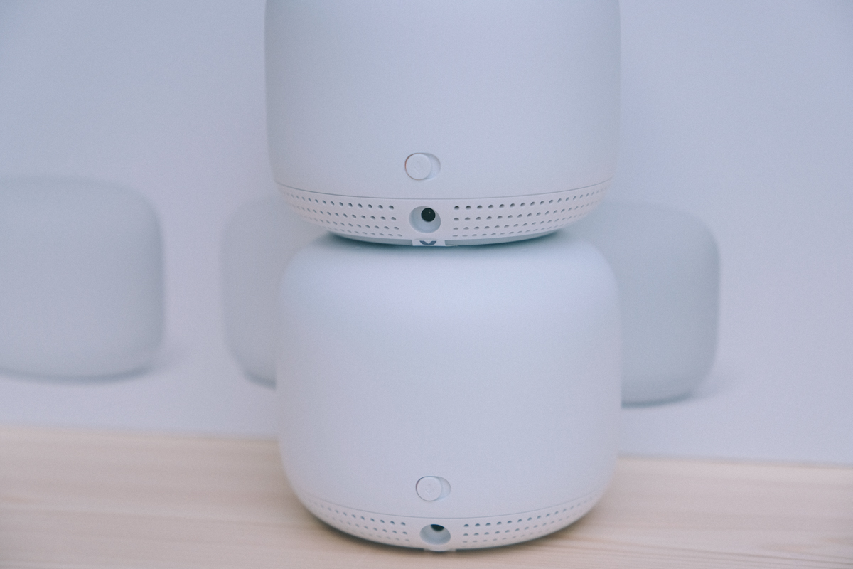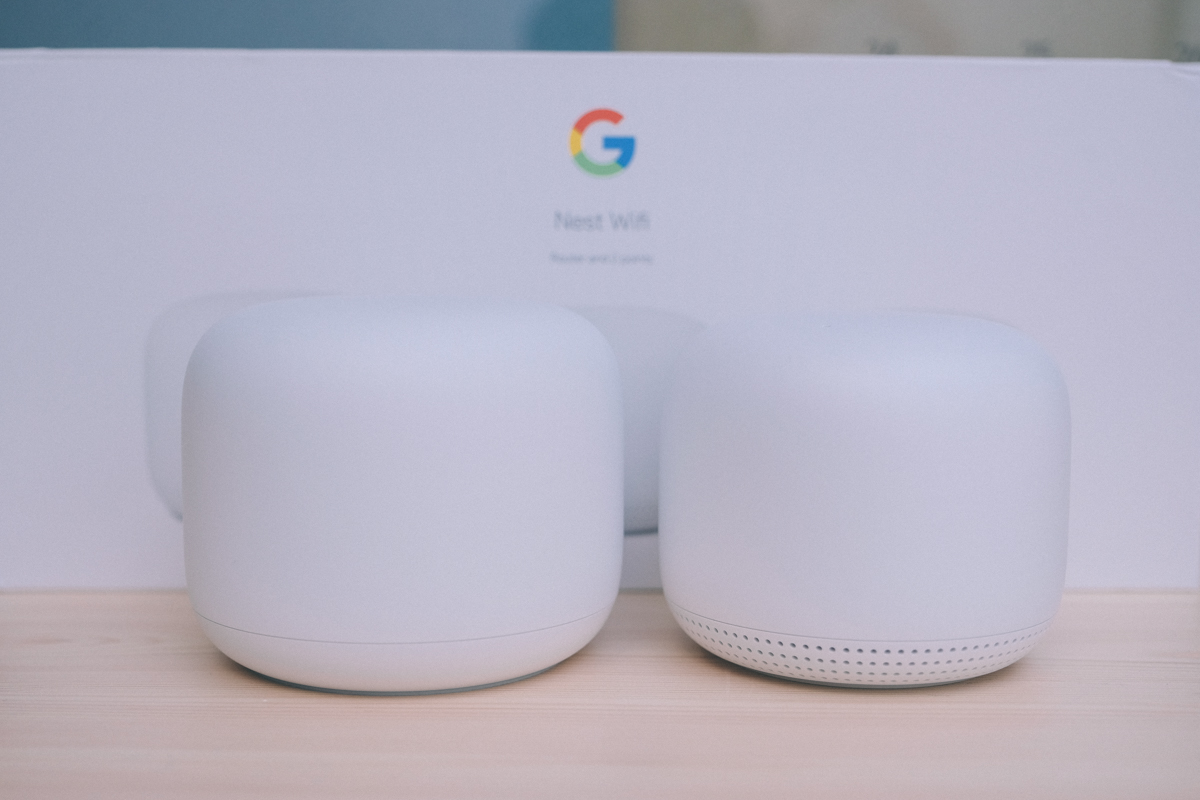 我購入的是 1 顆 Nest Wifi 加 2 顆 Points,左邊就是主要的無線路由器,右邊的就是 Point,主要差別就是,Point 是用來佈建 Mesh 網狀網路使用,而且內建有 Nest mini 的概念,佈置的位置還可以順便使用 Google 語音助理,非常方便,音質有些人估計是和 Nest mini 差不多,因為好像是用同一個零件,但是聽下來我覺得是比 Nest mini 的音質再好一些。