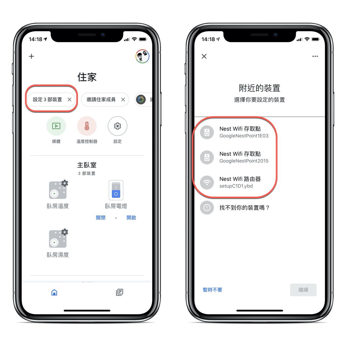 設定的部份,只要透過 Google Home APP 就可以設定,接電後就可以在 Google Home 上看到上方會出現「設定 3 部裝置」,如果你是只有 2 顆就是 2 部,然後就可以先選擇路由器開始設定,將基本的網路搞定後,就可以一一的設定另外的 Points 來搭建 Mesh 網路,詳細步驟我就不多講,APP 其實設定步驟真的很簡單,只要跟著走,大概不到 3 分鐘就收工了。