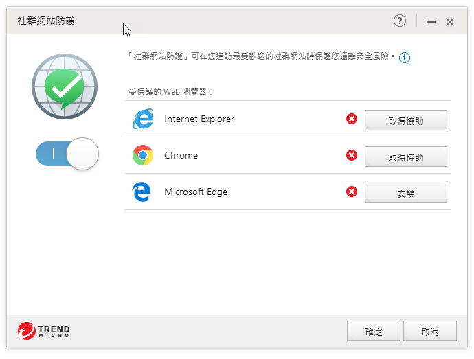第二個部份「社群網站防護」,這時應該會有同學立刻舉手發問,網頁防護不是有些防毒也有,為什麼一定要用 PC-cillin?各位同學不要急,首先進到 PC-cillin 的設定介面裡找到社群網站防護後,你會發現,為什麼開啟了這項功能,但全部的瀏覽器都是叉叉,因為還沒有安裝瀏覽器的外掛,往下阿湯以最大宗使用的 Google Chrome 來為大家說明。