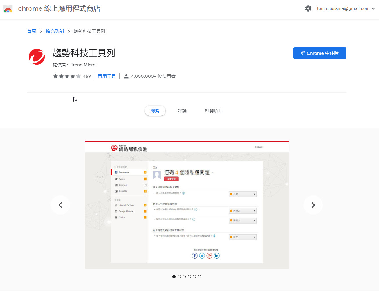 (或在 Chrome 設定 → 左下角擴充功能 → 搜尋「趨勢科技工具列」)