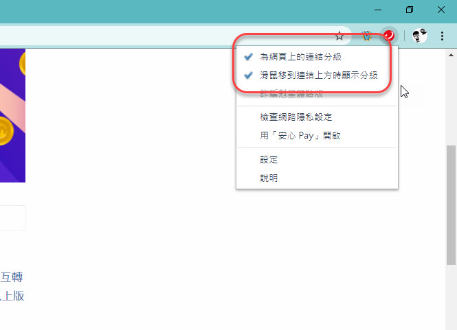 另外你還可以開啟「滑鼠移到連結上方時顯示分級」的功能,這麼一來在一般網頁中的連結你也可以先行檢測再點擊。
