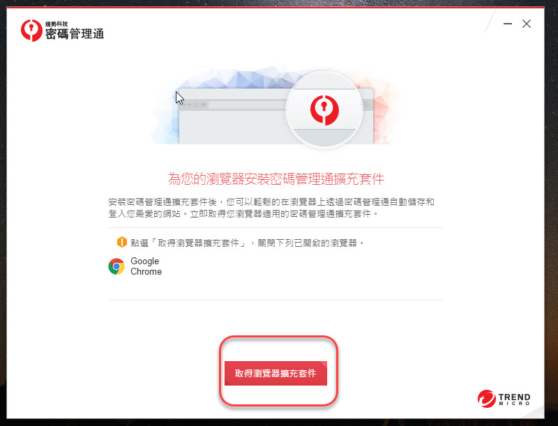 趨勢科技的密碼管理通同樣是透過擴充套件來協助管理,你可以依據畫面提供的取得前往安裝,或者直接前往以下 Chrome 商店安裝。
