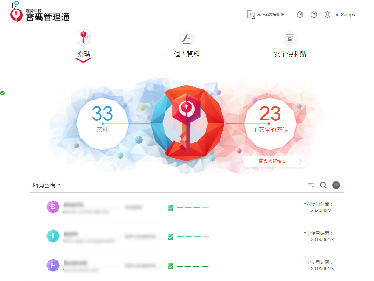 趨勢科技的密碼管理通會有一組超級密碼,想要取用密碼必須要輸入才能使用,所以就算和家人共用電腦也不用擔心,你有自己的獨立管理密碼空間。