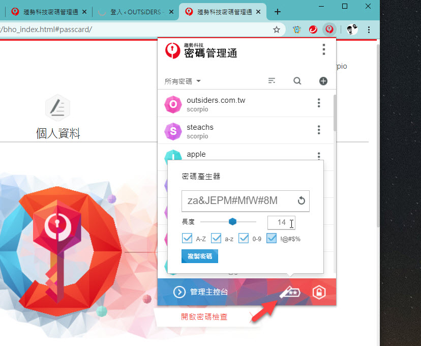 如果對於密碼的設定很困擾的話,直接用內建的密碼產生器就可以了,想要幾碼、以什麼規則來產生都能選擇,反正密碼會幫你記在管理通裡,所以用隨機產生的密碼是非常安全也不用擔心忘記。