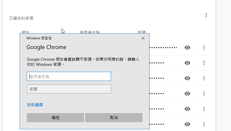 每一項功能都一定會有同學舉手發問,密碼管理 Chrome 就有了啊,一樣可以直接登入網站,幹嘛還要額外裝軟體來用,來來來,說明一下差別,Google Chrome 內建的密碼管理總的來說算是好用沒錯,但在隱私及安全性上並不是那麼完善,以前 Google Chrome 儲存的密碼直接進到設定裡就可以一一的打開檢閱,現在好一點點,還需要輸入電腦的帳密(Windows 要帳密、macOS 帳號通常會自動帶出,只要密碼即可),才能顯示,但畢竟電腦的帳密真的太不可靠,比如今天和家人使用同一台電腦的話,如果電腦沒有區分使用者登入的話,那麼,你的爸爸媽媽哥哥姐姐妹妹弟弟阿公阿嬤都知道電腦密碼,誰都可以來查看你的儲存密碼,超級沒隱私,所以我個人建議只有不重要的密碼才用 Chrome 儲存,否則能夠用其他密碼管理的軟體來負責是最好的。