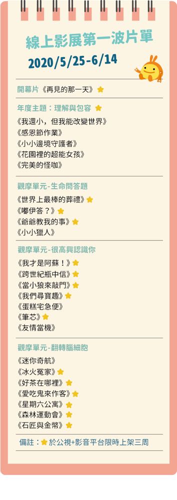 由公共電視與富邦文教基金會主辦,三創生活園區、永齡基金會與鴻海教育基金會主力協辦的「2020 台灣國際兒童影展」,原訂三月底舉行實體放映,只是因為新冠肺炎疫情取消。現在主辦單位為了讓這些影視佳作還是有機會被看到,同時配合防疫,特地與「公視+」影音平台合作,以線上影展的方式和大小觀眾見面。讓大家不用搶票,不論在台灣哪個角落,透過網路就能在家親子共享影展精彩好片。