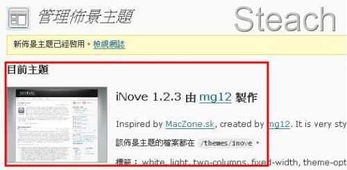 就會看到目前主題變更為剛剛啟用的iNove佈景,如此一來就更換完成,趕緊回到首頁看看換好的佈景吧!