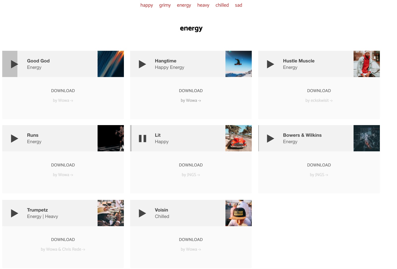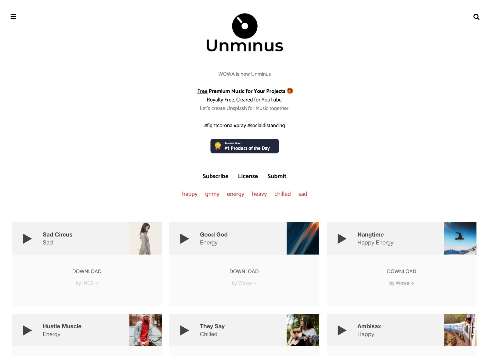 網站:https://www.unminus.com/進入網站後,主要分類就只有六種,分別是 happy、grimy、energy、heavy、chilled 及 sad,音樂我沒看有多少首,但每一首的品質都不錯。