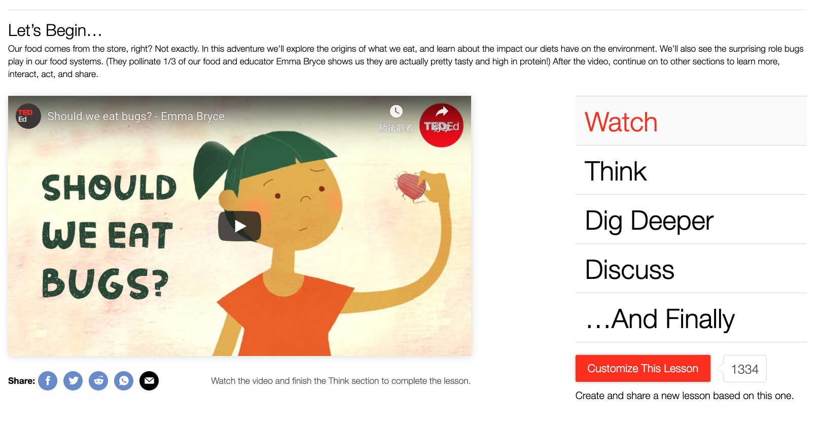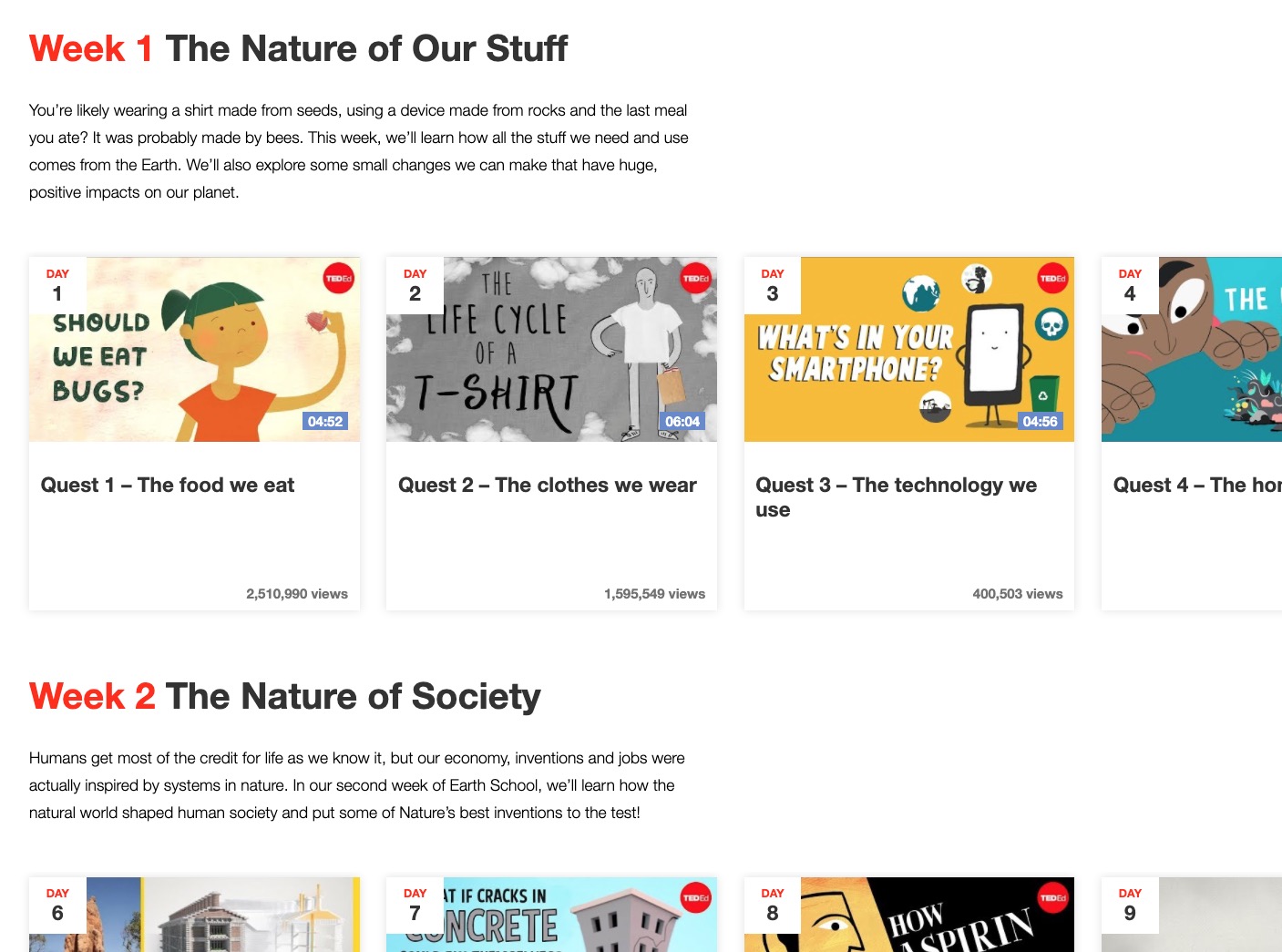 網站:https://ed.ted.com/earth-school前往 TED 的教育網站就可以直接觀看,不需要註冊,也不用費用,課程一共分為 6 週,每週是五堂課程,所以你可以分為一個半月,除了週末以外的時間和小朋友每天看一部來學習,每部時間都不超過十分鐘,但都相當的有意思。