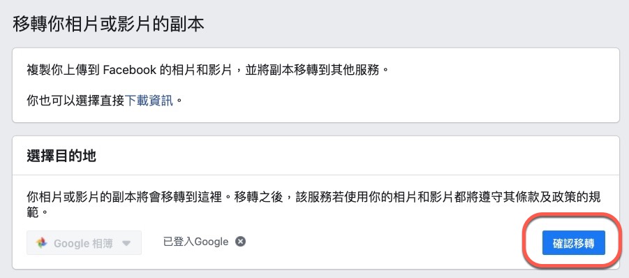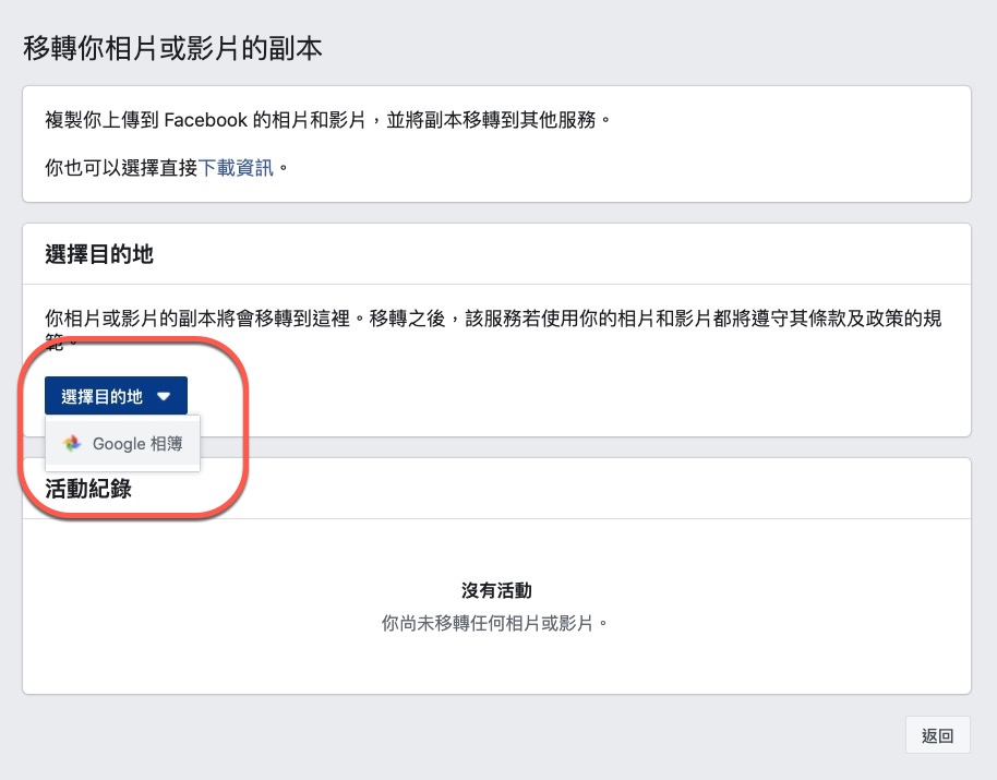 依序做完相片跟影片的移轉後,就會在這裡看到二項都在進行中了,大概就等一下,看你相片量有多少,基本上不會太久,就可以在你的 Google 相簿裡看到 Facebook 備份過去的相片了,原本的相簿如果有區分日期的話,也都會原汁原味的轉移,不用再花時間整理一次。