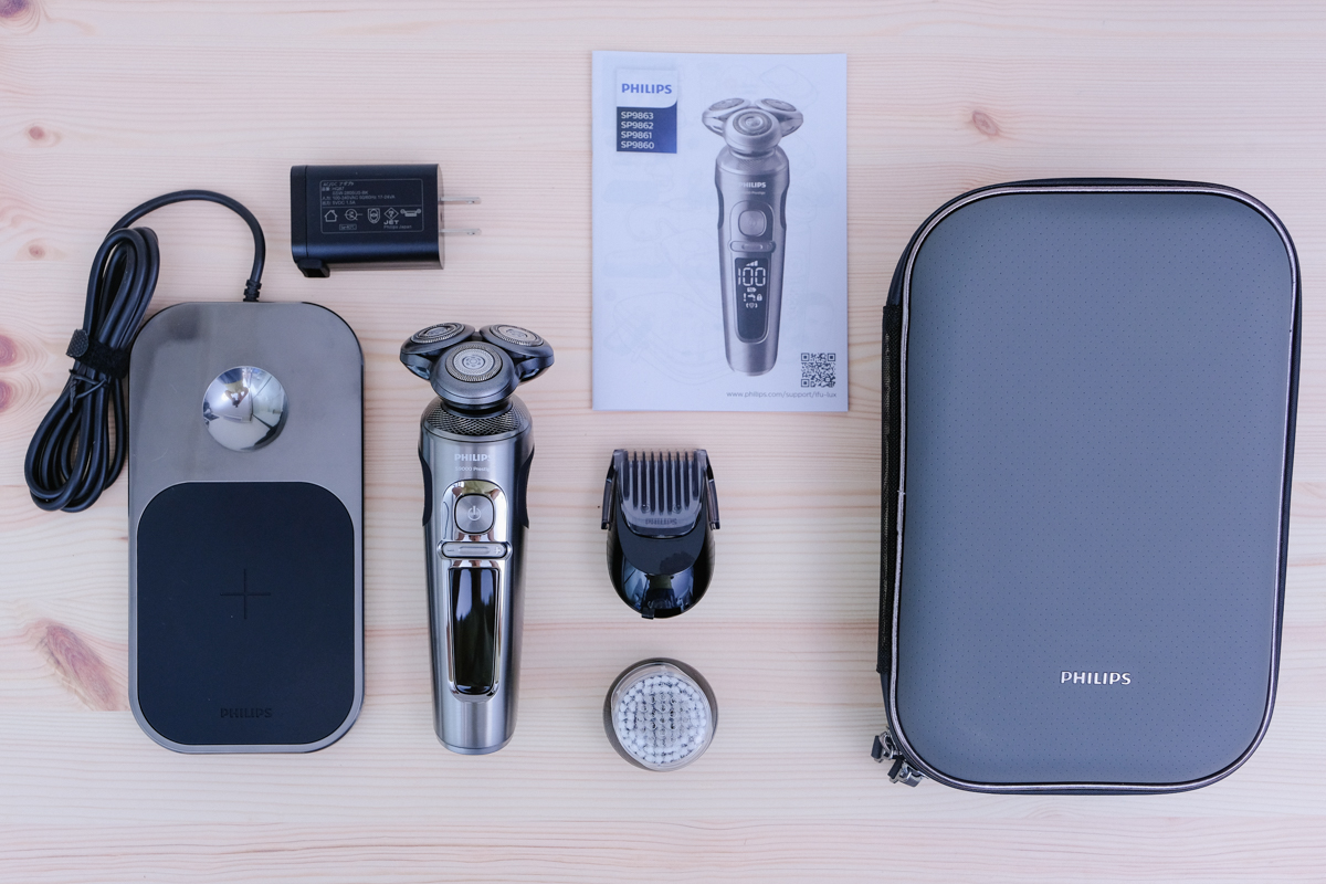 標準配備包括有飛利浦電鬍刀本人(搭載 AI 智能偵測系統)、支援 QI 的無線充電板、電源變壓器、潔顏刷、造型修容器、使用說明書及收納包。