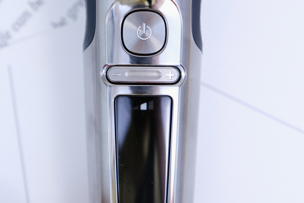 電鬍刀的操作就是要簡單,隨時拿起來都能立即使用,拿起只要按一下電源鍵就可以立即開刮,而下方的 + - 按鍵則是可以調整模式。
