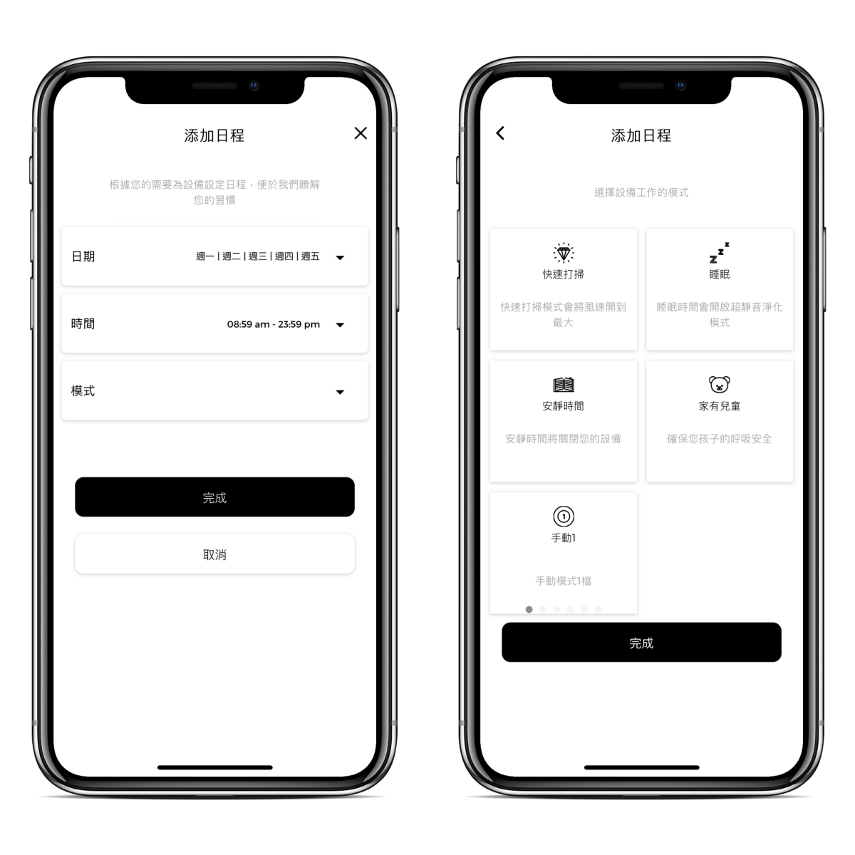 如果你是 24 小時不關機放在臥房,那麼睡覺時間到了還要手動切換成睡眠模式嗎?不需要,只要在智能行程裡加入排程就可以了,設定好對應的時間就會自動幫你切換,預設的工作模式包括了快速打掃、睡眠、安靜時間、家有兒童及手動選擇,像是快速打掃我就搭配著掃地機的排程,比如掃地機每天 10 點打掃,每次約 20 分鐘,那麼就可以設定 10:00~10:25 啟用快速打掃模式,可以讓掃地機揚起的一些灰塵快速被過濾掉。
