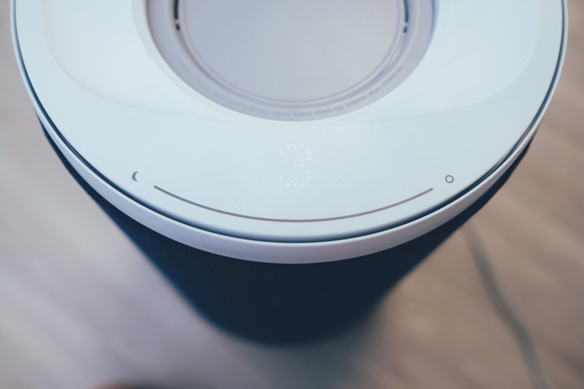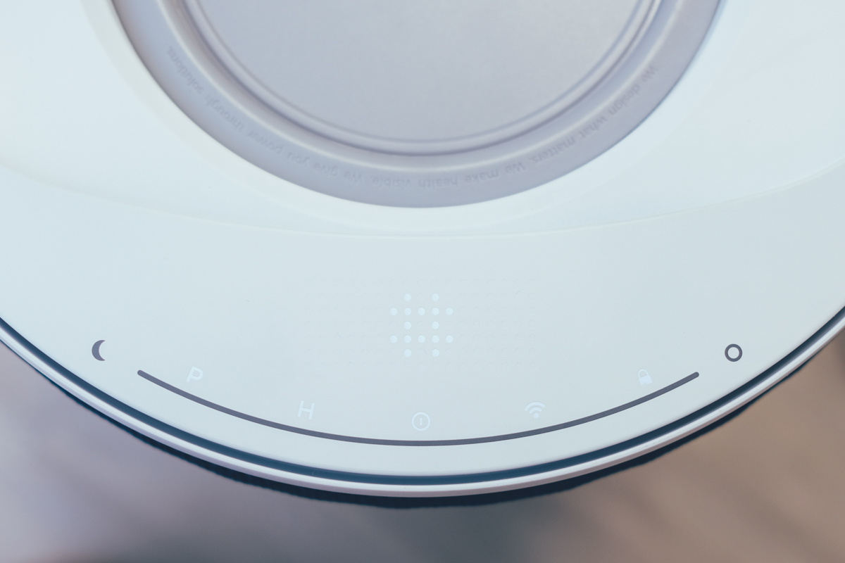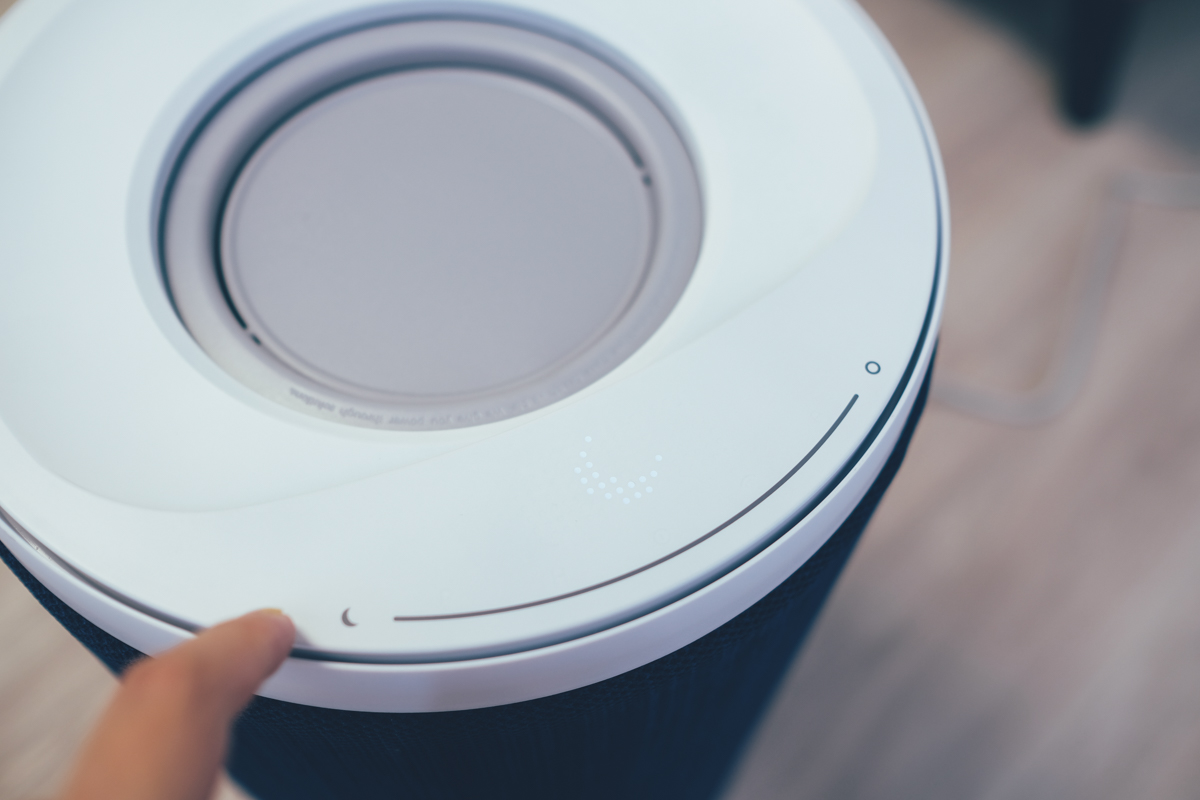 我們來看一下方上的出風口及控制面板區,首先是出風口的設計,和一般空淨機一樣,都是朝上出風,將乾淨空氣過濾網往上送來帶動空氣循環,但如果你不是 24 小時開機的人,應該很容易在不使用時讓出風口堆積灰塵,而且落塵是會直接掉進內部的濾網或是風扇,假設你靜置一個月不開機,那麼當一開機就會有可怕的灰塵被吹送出來。