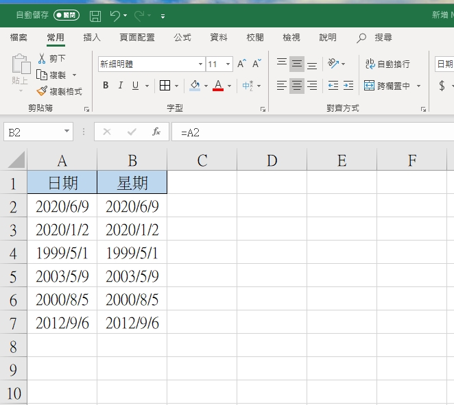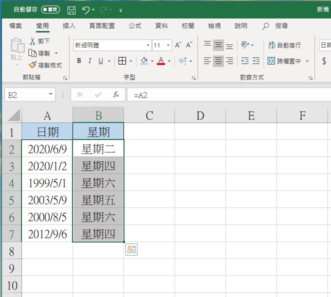 先來說明不使用函數的方法,首先在星期的那一排先將資料都等於日期,我們可以直接將第一欄 =A2 後往下拉,讓資料和隔壁的同步。