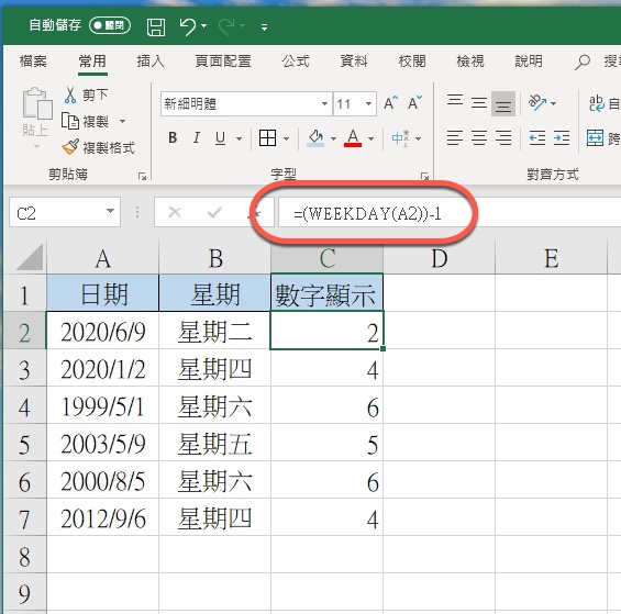 第二種是透過函數來做,在 Excel 函數裡有一個叫做「Weekday」的公式,主要就是用來顯示目前的日期是該週的第幾天使用,順序會是日、一、二、三...以星期日為第一天,所以當我們要顯示為星期幾時,只要將結果減 1 就是了,所以我們可以將公式寫成如下: