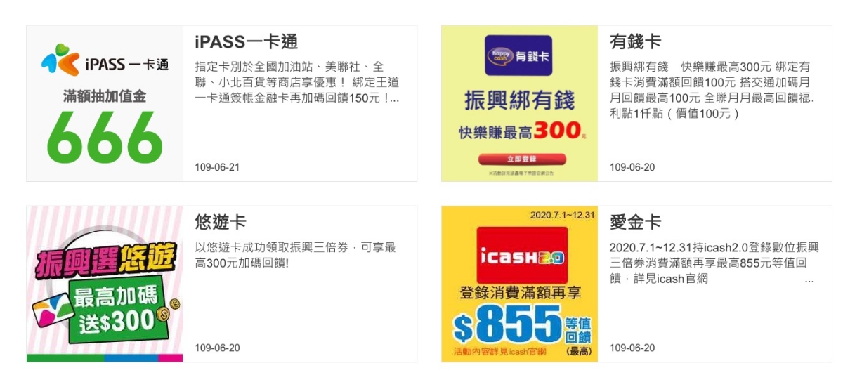 電子票證的部份,基本上常用的都有活動,像是悠遊卡、一卡通等。
