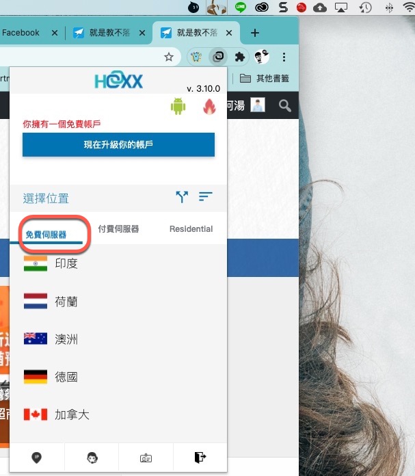 VPN 相關的軟體阿湯自己手邊是隨時備著至少有五個以上在輪替使用,雖然也有付費帳號,但有時候某些國家要翻牆真的有點麻煩,所以都要多準備幾個,今天再來分享一個 VPN 服務叫做 hoxx,分別有提供免費及付費的 VPN 服務,免費主要提供 18 個國家的 VPN 節點讓你使用,而且沒有限制流量(速度也似乎沒特別限制),跟付費最主要的差異應該是加密的程度,還有可使用的頻寬,所以用在一些不重要的地方使用是沒有問題的。