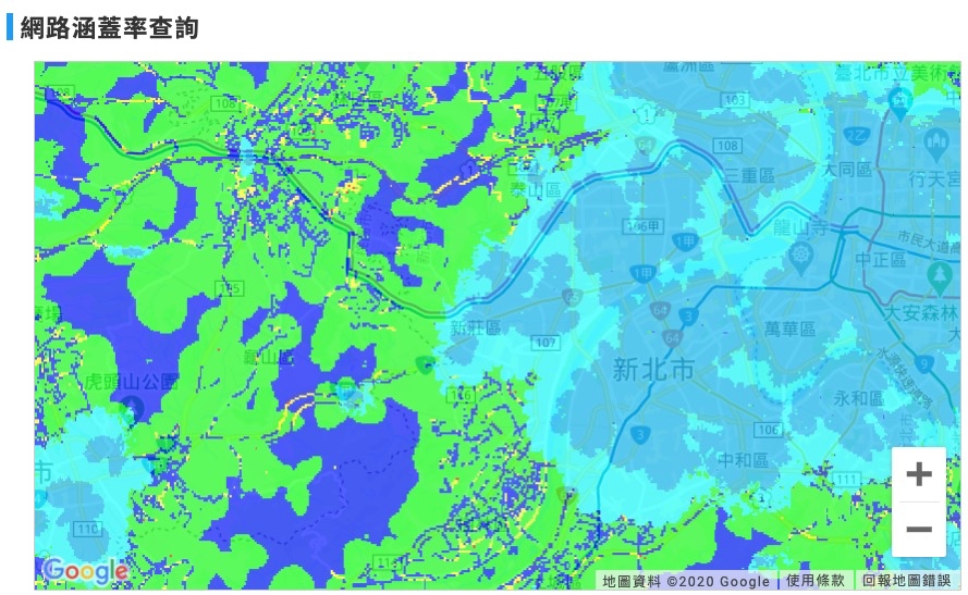 地圖放大後可以細看每一區域,像中華的是藍色,深藍色是訊號好的,其實淺藍色不用看,按照之前 4G 的經驗,沒有深藍色的話大概也只會跑 4G 為主了。