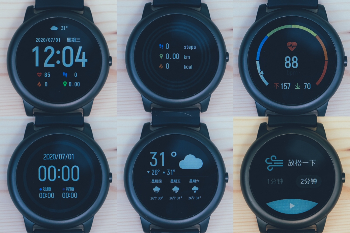 剩下的操作主要就是上下左右,如果想要快速查看資訊的話,可以左右滑動,分別可以查看當天的走路步數、距離、卡路里,心率偵測、睡眠狀況、天氣預報跟放鬆模式。