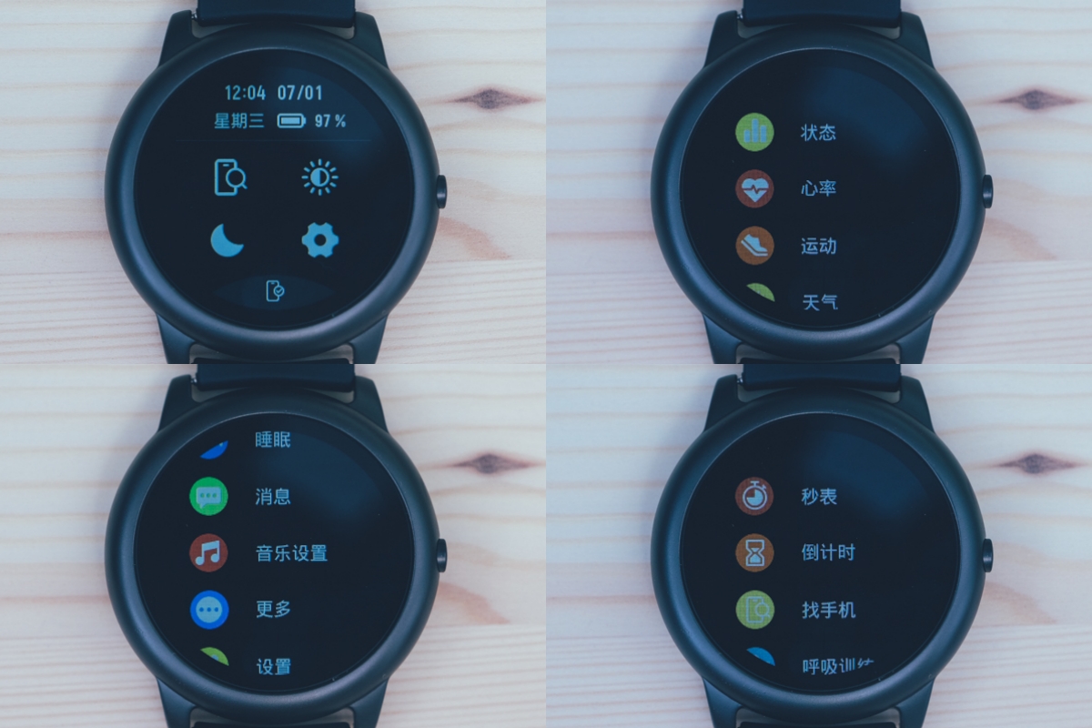 由下往上滑動是進入功能列表,包括狀態、心率、運動、天氣、睡眠、消息、音樂、碼錶、計時器、尋找手機功能及呼吸訓練,所有的操作都在這功能列表當中。