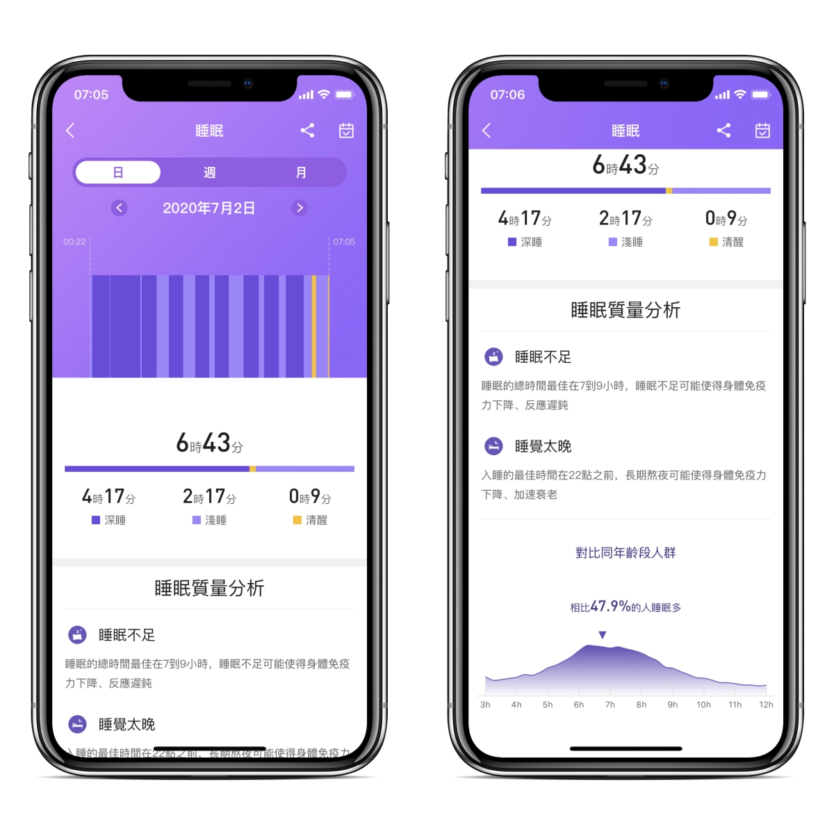 以睡眠資料來說,可以查看當天、當週、當月,這樣就可以了解你近期的睡眠情況,像是淺眠、深眠的各別時間,就知道你究竟睡的好不好了,像阿湯每天幾乎都是秒睡,果然深眠熟睡的時間相當的長,很多人的深眠時間都沒有超過總睡眠時間的 50%,想知道就戴上 Haylou Solar 來試試吧。