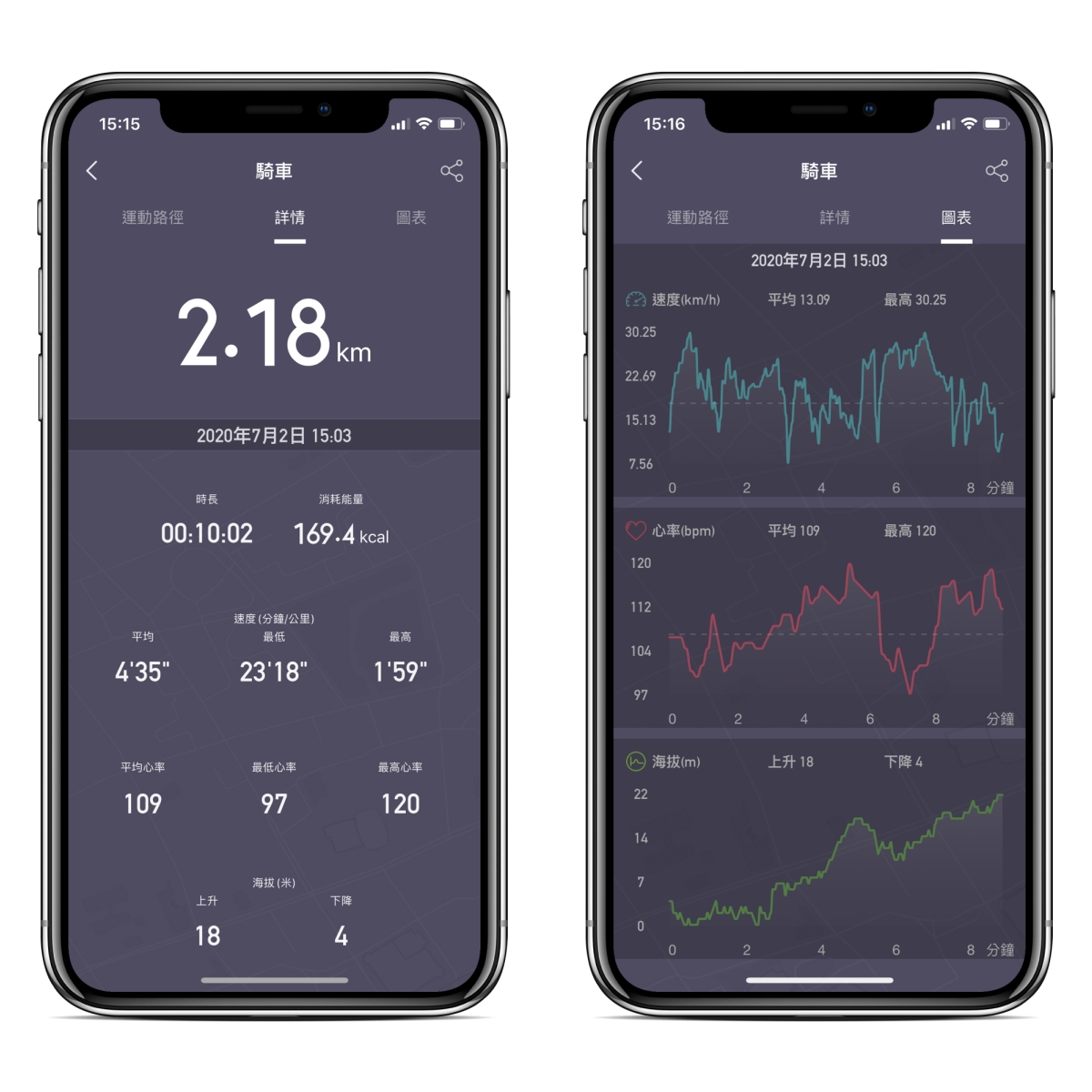 在 APP 裡也可以詳細的查看配速狀況、心率以及海拔,這對於騎乘訓練是相當有幫助的。