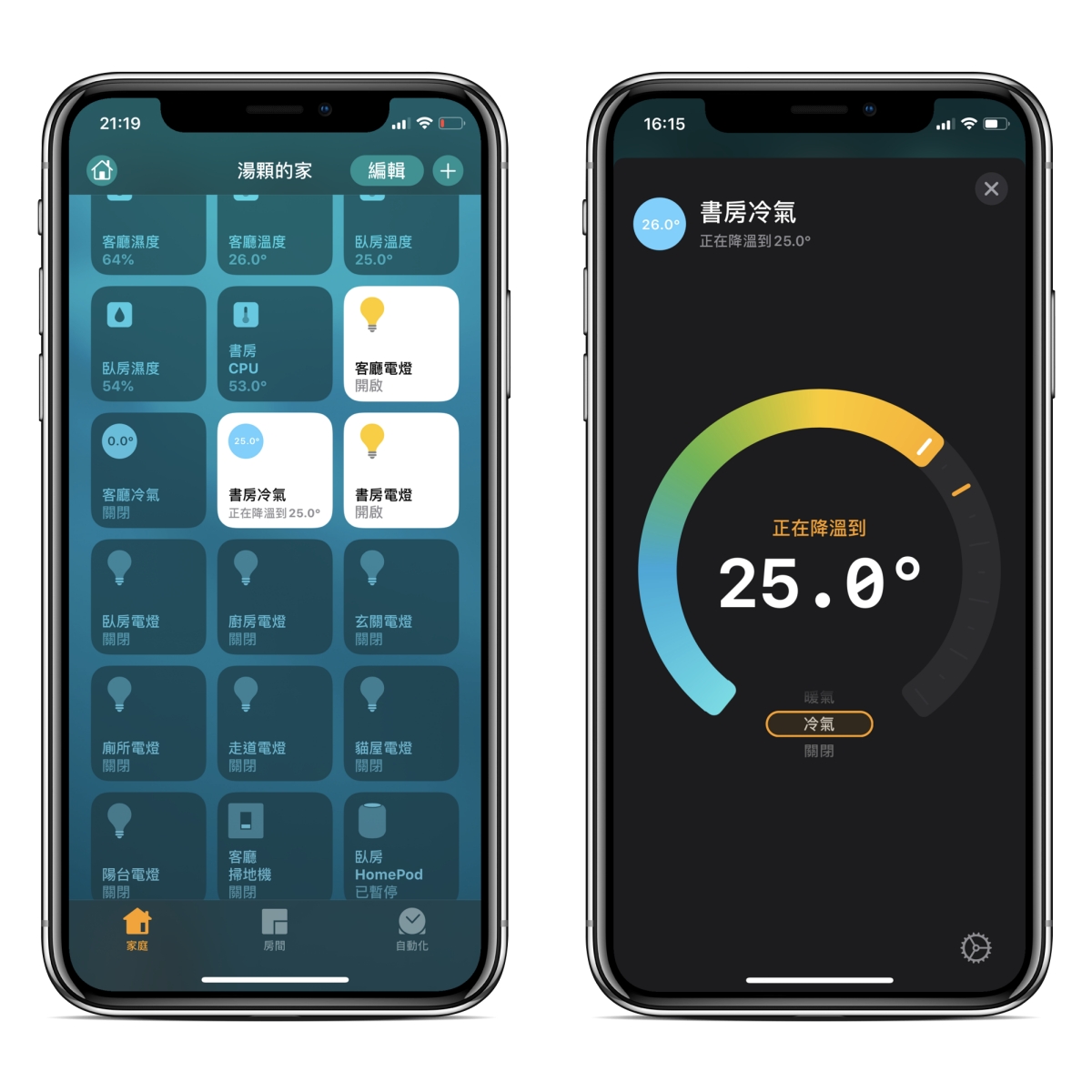 就這樣搞定了,我家能用的二台冷氣,東元接線其實腳位有點不同,所以我是手動換過後接上就可以了,但小問題是只能開跟關,且狀態不會同步,而書房的是 Panasonic 的 PX 系列,完全沒有任何問題,能控制的主要是自動模式、冷氣或暖氣,溫度也能直接指定要設定為多少,全部都跟 SIRI 講就可以了,不需要再用遙控器了。