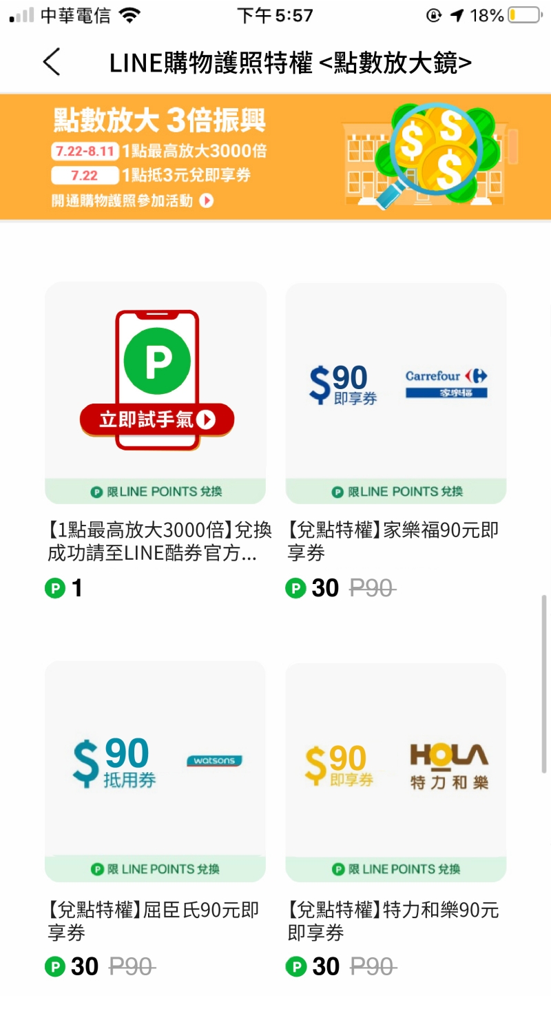 - 兌點特權活動二(活動期間:7/22 當天)從主活動頁面點入兌點活動,就可以 30 點兌換家樂福、萊爾富、屈臣氏及HOLA 90元購物金,完成兌換後至實體店面消費即可出示折抵。大家如果常到這幾家消費,趁機兌換點數,消費起來愈划算。