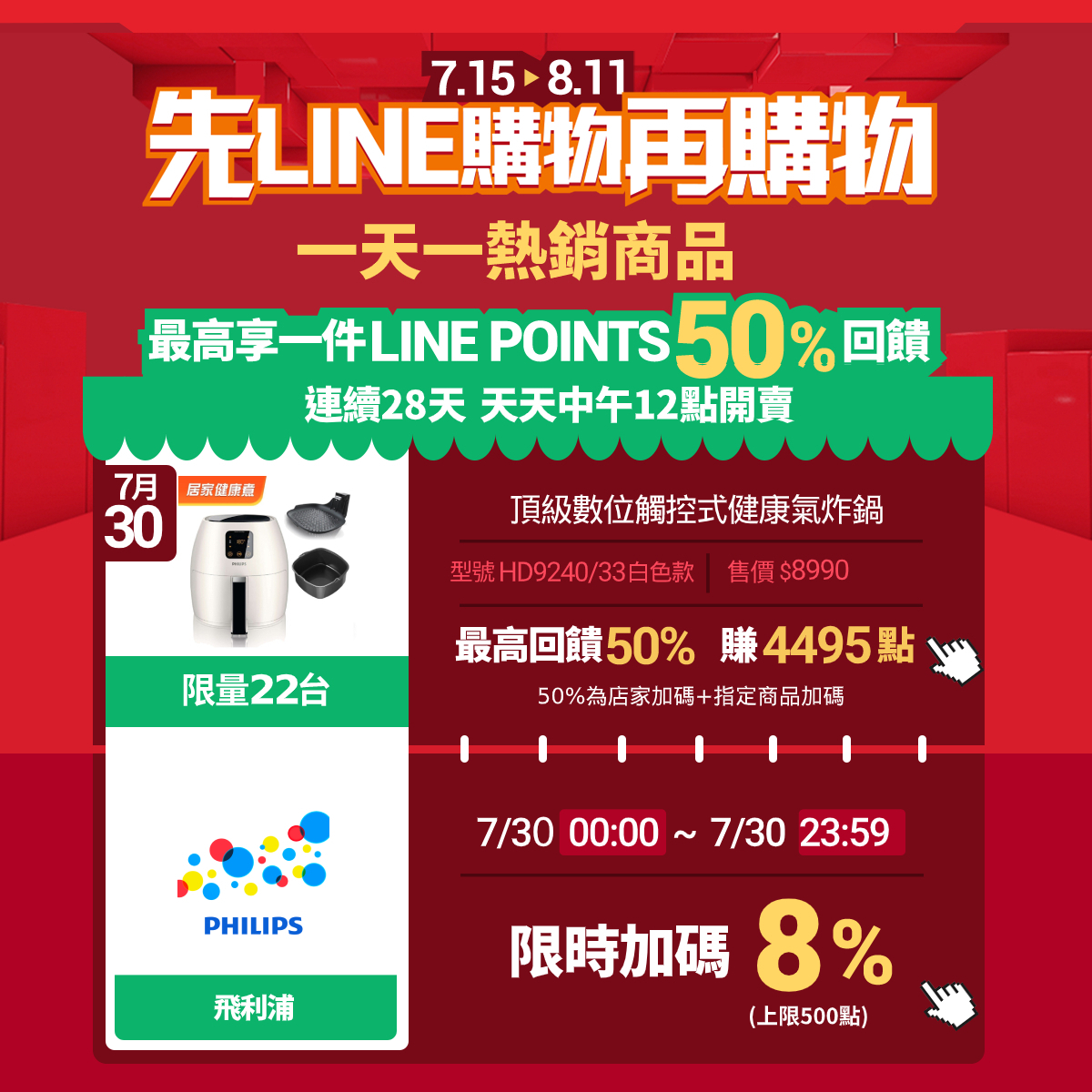 - 活動內容:只要購買「每日限量熱銷商品」,過鑑賞期後沒有退換貨,就可獲得 50% LINE Points 點數回饋