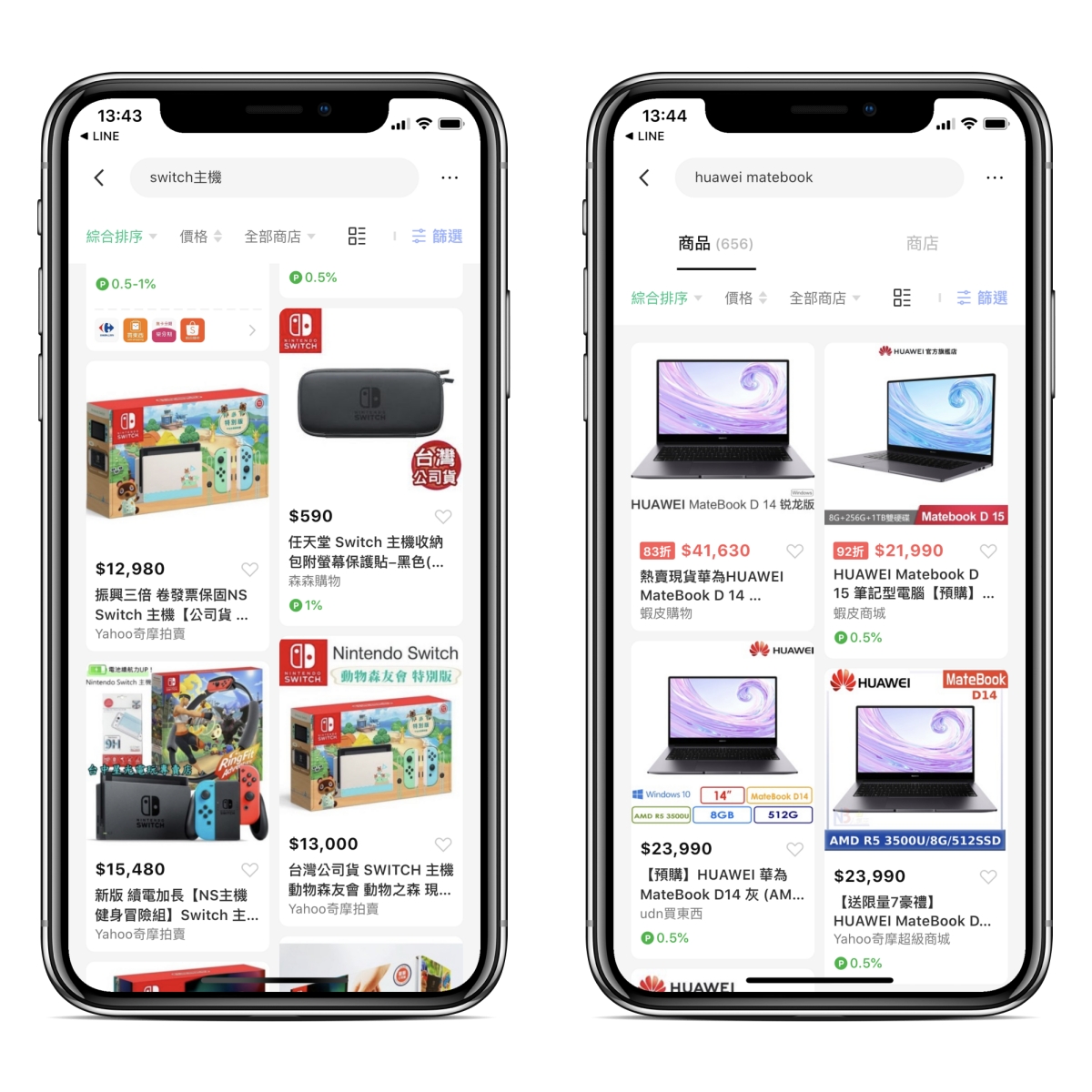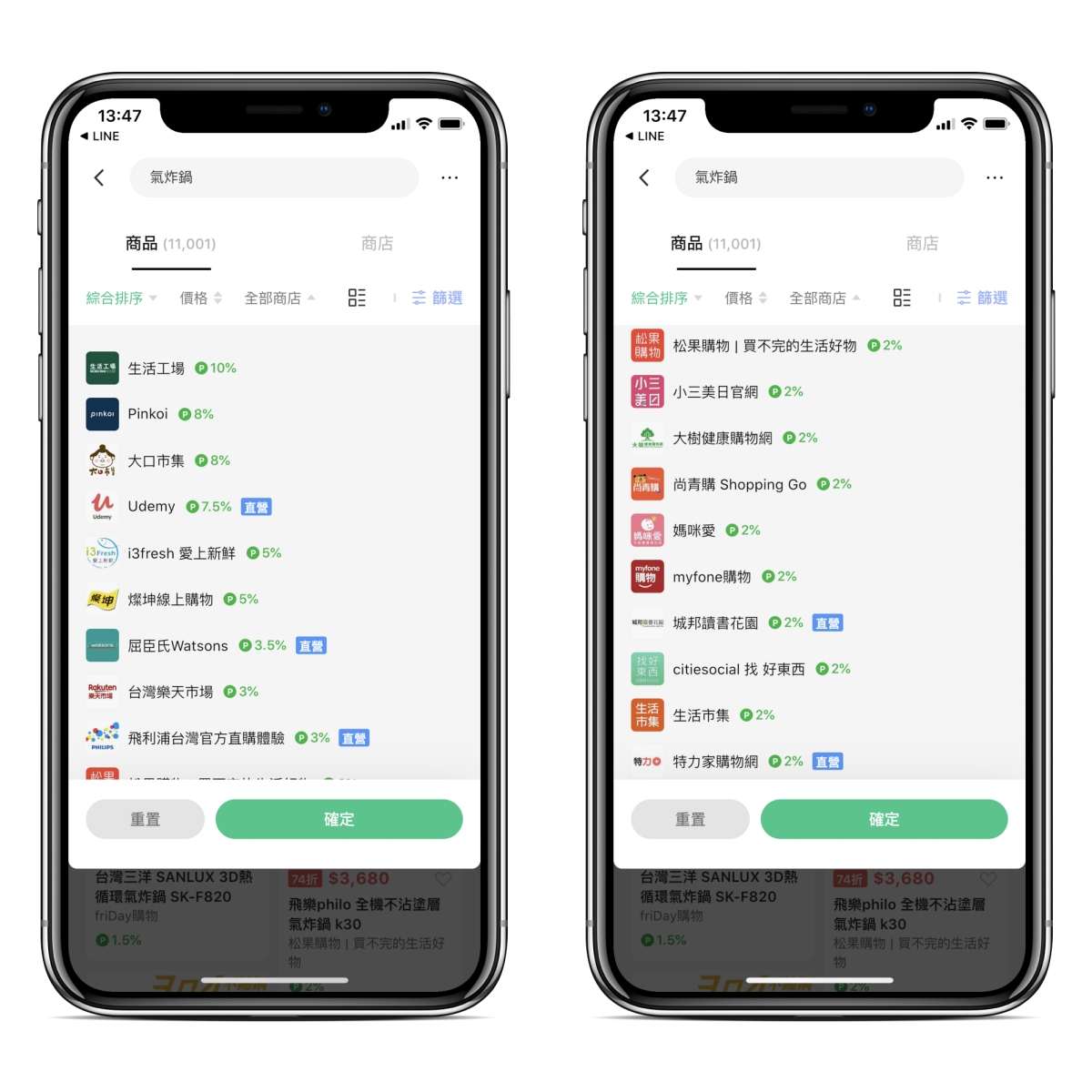 這非常的重要,特別是當單價高的商品很常會出現價差,特別是有活動時像是 XX 購物節,可能在 PChome 買是 9,999,但在 Yahoo 是 10,999,這種各購物平台太比拼就很容易出現不同優惠價格,而透過 LINE購物的好處就是,搜尋產品後立刻就可以查看各線上購物平台的販售價格各是多少,你就不需要再去 Google 一間一間找了,不只是貨比三家,是比很多家,不僅僅是列出價格,也可以看到哪裡買回饋最多 LINE Points 點數。