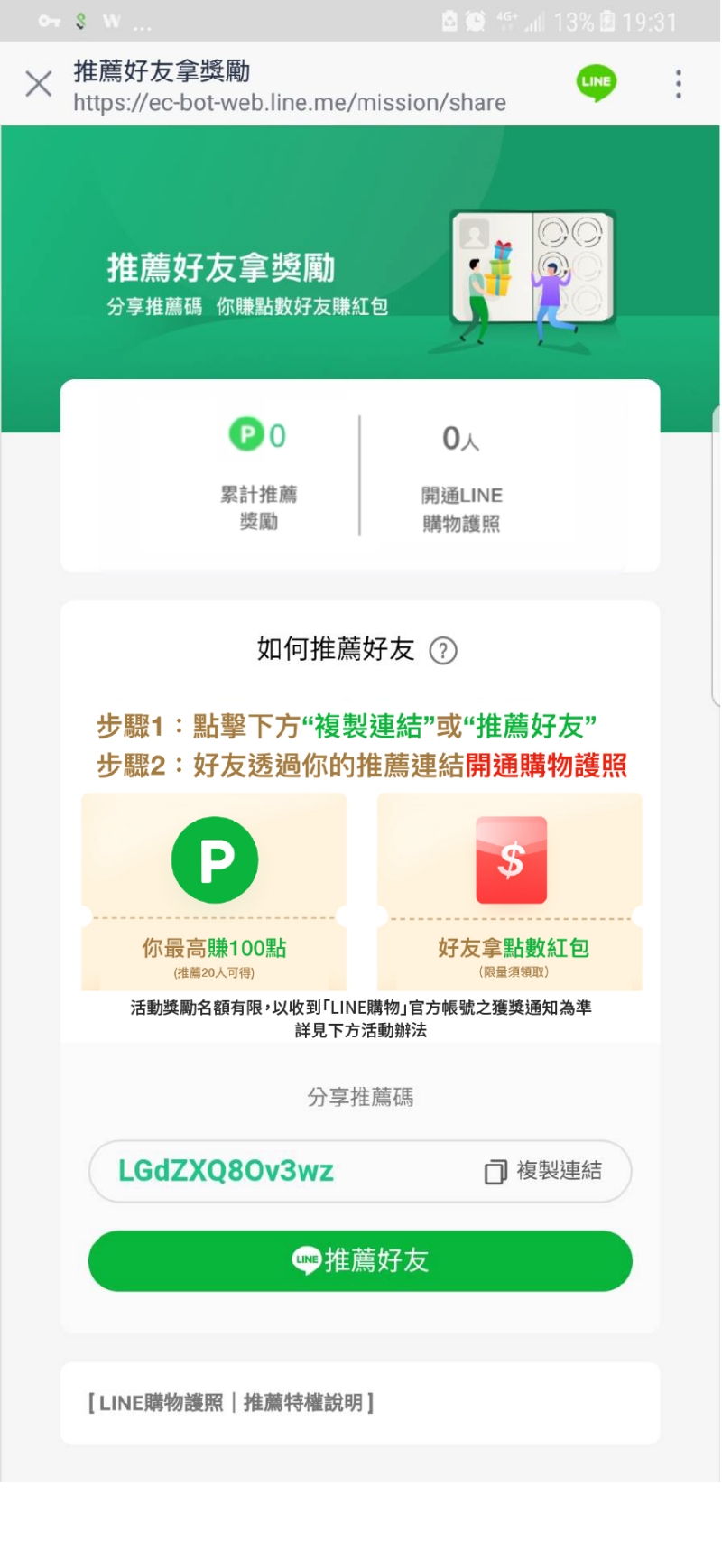 你只要提供自己的推薦連結給朋友前往開通 LINE購物護照,每當有一位朋友透過你的連結成功開通 LINE購物護照就會獲得 2 點,最高累積為 100 點。