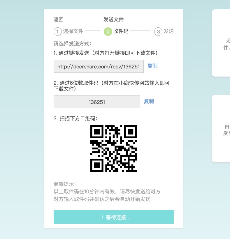選好後,就會有三種方式交給對方來下載檔案,看是要用連結、取件碼或是 QR 都可以,如果是你想用手機下載,那就是用 QR 最方便。