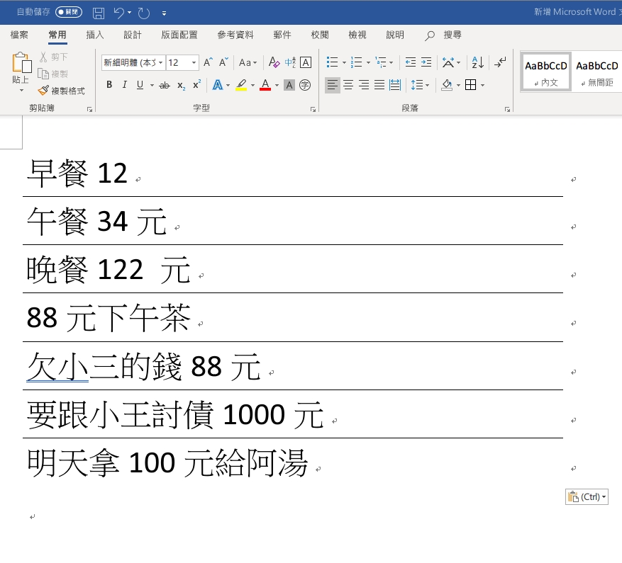 假設我今天的內容是用來記帳,那可能會像這樣,如果你單純的記錄一些款項跟文字標記的話,或許你會在 Excel 那邊記錄,那麼你也可以將表格複製後貼到 Word 來做。