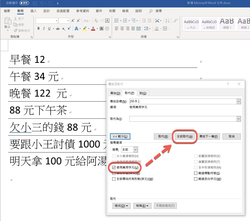 在更多選項中勾選「使用萬用字元」然後按下全部取代。