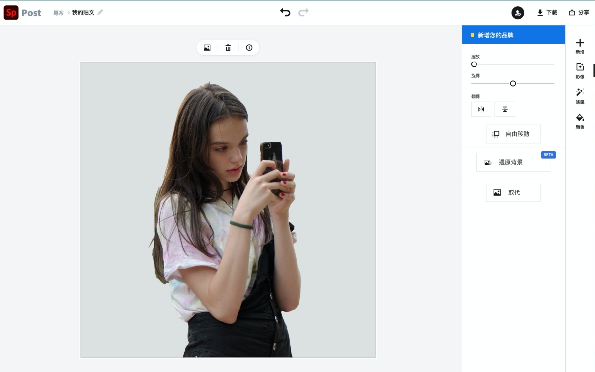 這樣就完成去背了,不過用 Spark 去背有個小缺點,就是你去完背後一定要在他這邊編輯,因為輸出時,不會是透明背景,因此比較建議,如果你的圖片可以在這裡完成編輯的再用,不然在這裡去背就沒意義了,但其實內建的功能跟素材還真不少,我覺得已經非常夠用了。