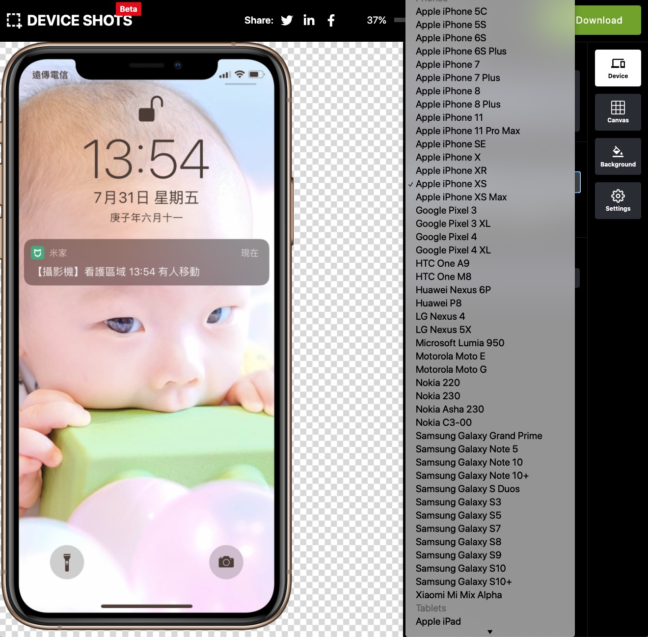 右邊還可以選擇不同的設備做切換,大原則就是,你上傳的圖片解析度要跟選擇的設備能夠相對應,不然會是不成比例的哦。