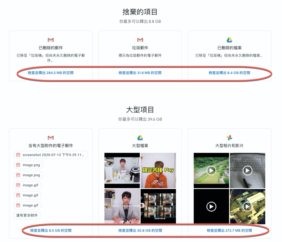 第二個是大型的項目,針對 Gmail 比較佔用空間的附件郵件、雲端硬碟中的大型檔案以及 Google 相簿中大型的相片及影片,幫你篩選出來後,你再自行選擇是否要刪除。