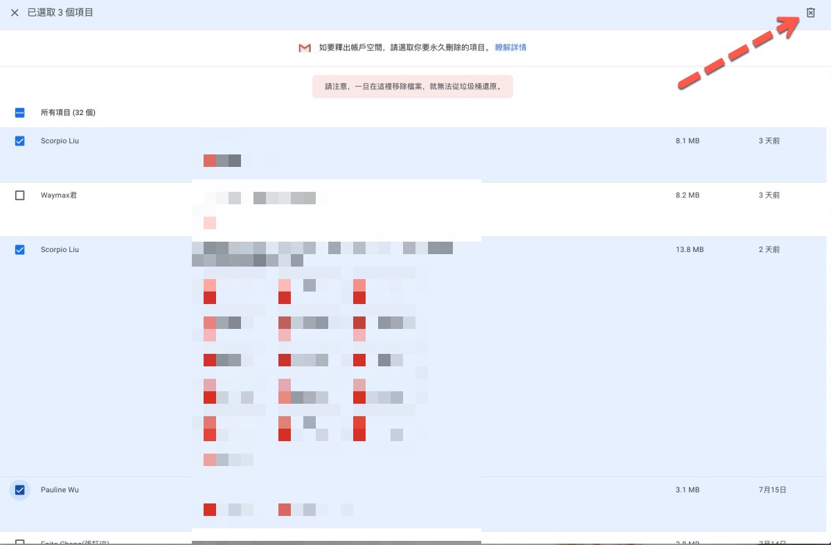 每個點進去後,可以自行勾選要刪掉的檔案,也可以直接透過右上角一鍵全部清空。