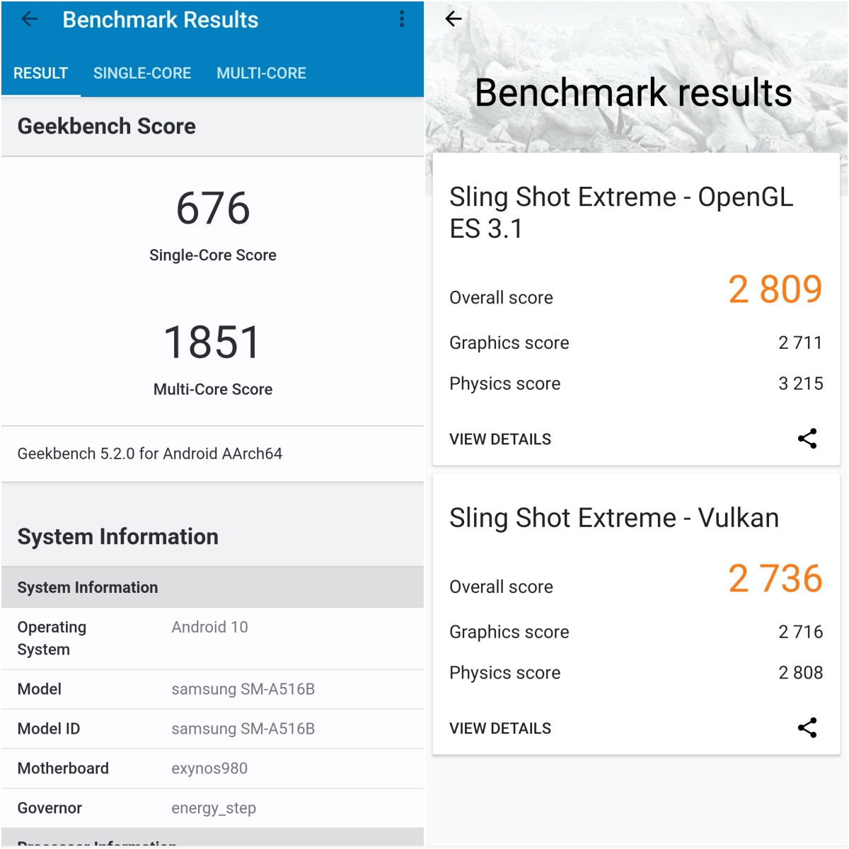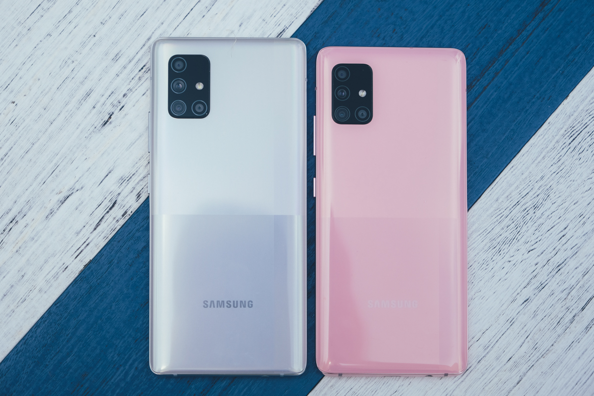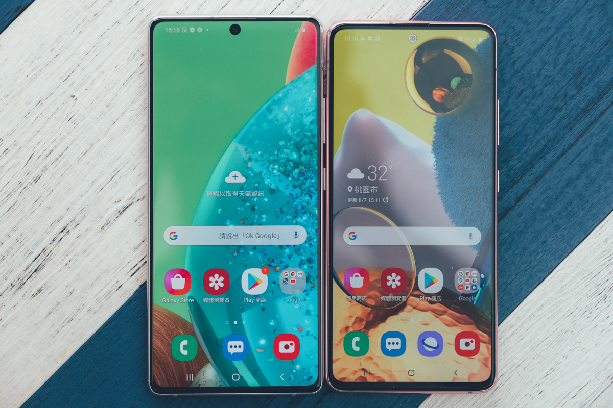 左邊是 Galaxy A71 5G 版,螢幕尺寸略大一些為 6.7 吋,在規格上和右邊的 Galaxy A51 5G 差異不大,主要差在記憶體(A71 RAM 為 8GB)、跟主相機的像素(A71 為 6400 萬)以及閃電快充的速度(A51 為 15W、A71 為 25W)。