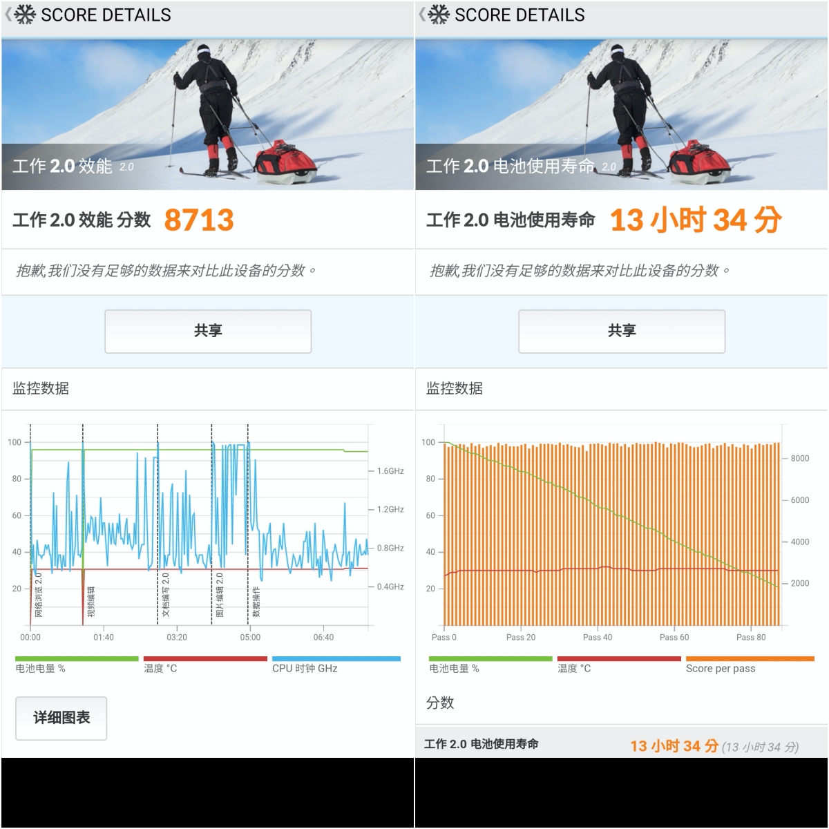 透過 PCMark 工作 2.0 效能測得分數為 8713,續航測試則是獲得 13 小時 34 分,足以應付一整天的使用,不需要額外再進行充電。
