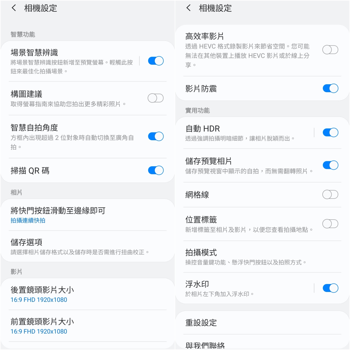 相機中的設定,包括場景智慧辨識、影片防震等,如果對於自己的拍照構圖較沒信心的,也可以開啟構圖建議,最基本能夠協助你拍出好的水平線,不讓照片歪斜,而有些構圖建議也會讓你拍出奇蹟美照。