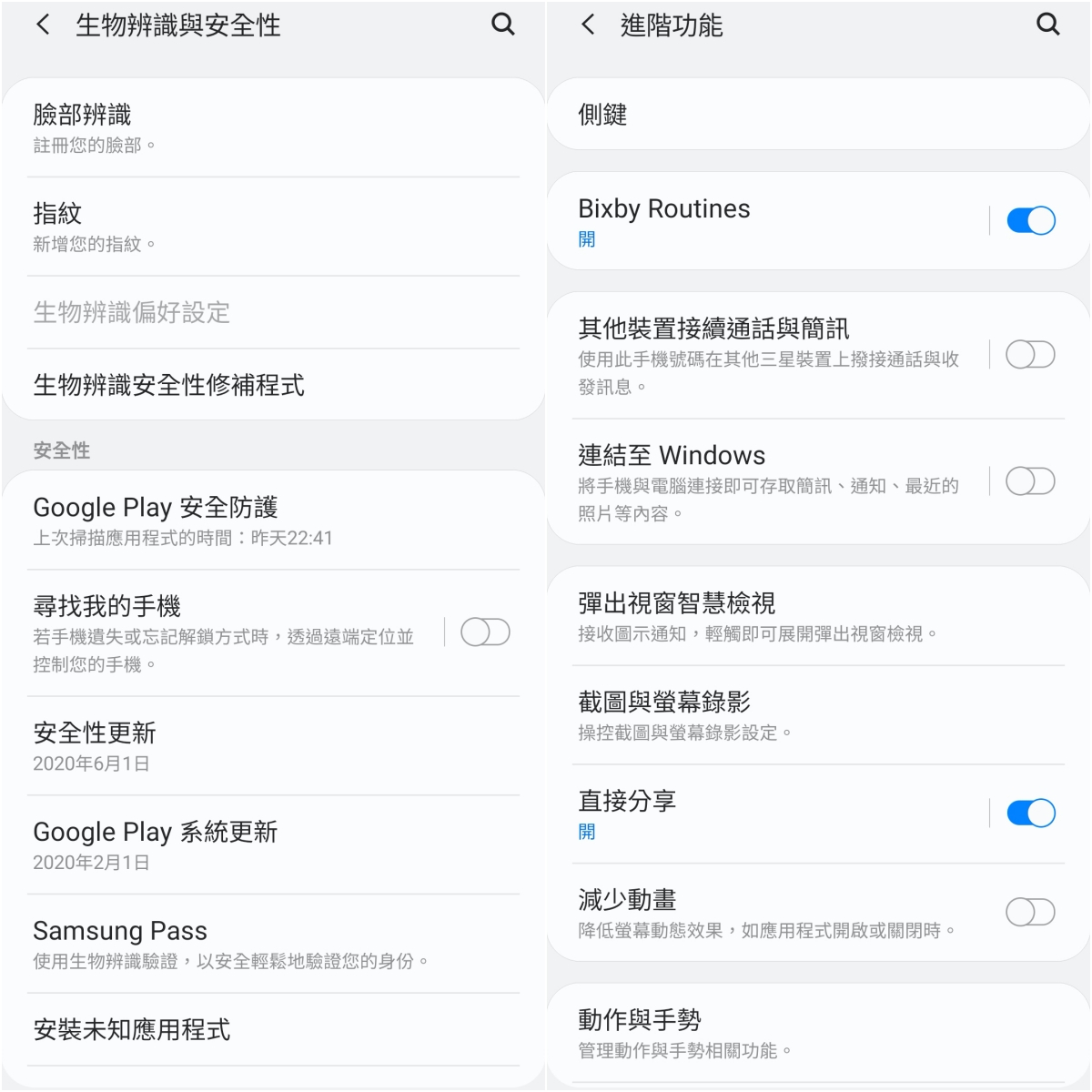 安全性的部份支援臉部辨識、指紋辨識,可用於 Samsung Pay 等行動支付使用,另外在進階功能也可以設定側邊按鍵、截圖及螢幕錄影等相關功能。